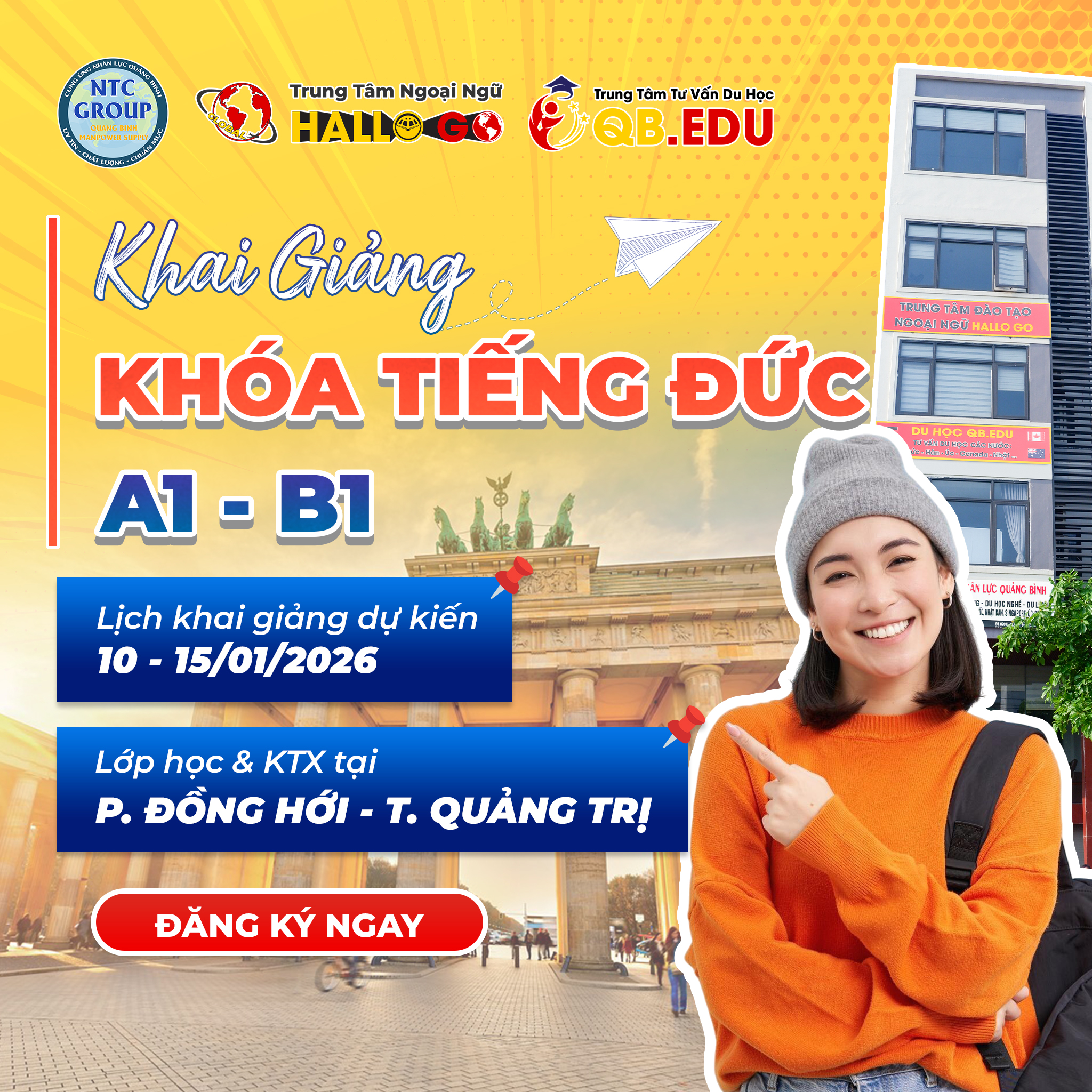 Trung tâm Ngoại ngữ HalloGo kết hợp cùng Du học QB.EDU chính thức mở khóa tiếng Đức từ A1 → B1 ngay tại Đồng Hới với lộ trình rõ ràng – phù hợp mọi bạn trẻ có định hướng du học nghề Đức.