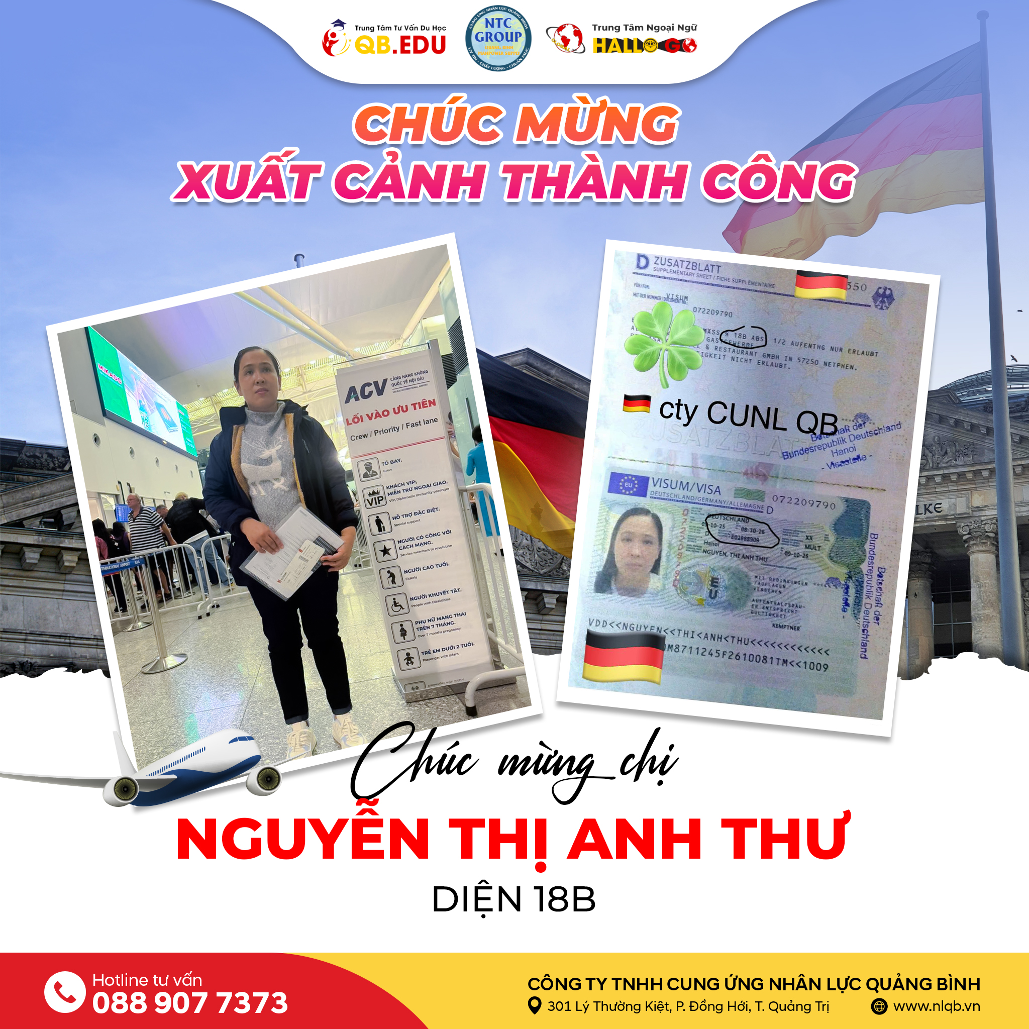 Cung Ứng Nhân Lực Quảng Bình xin gửi lời chúc mừng chân thành đến chị Nguyễn Thị Anh Thư – người đã xuất cảnh thành công sang Cộng hòa Liên bang Đức theo diện Visa 18B, mở ra chương mới trong sự nghiệp và cuộc sống nơi châu Âu. 🇩🇪✈️