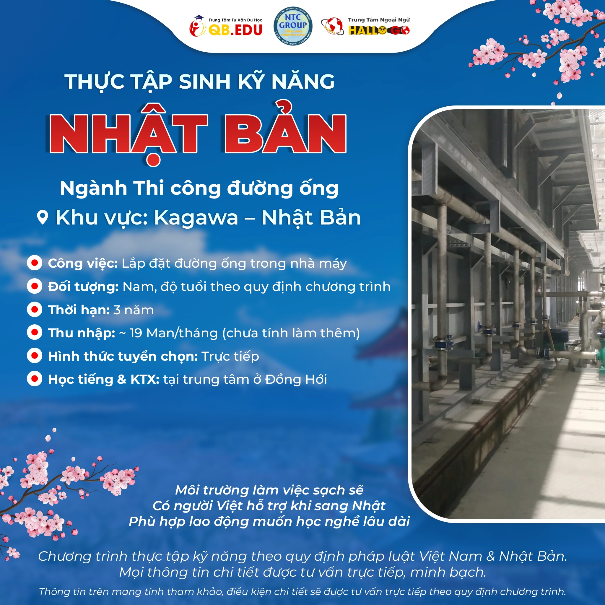 Chương trình Thực tập sinh kỹ năng Nhật Bản 2026 tuyển dụng ngành thi công đường ống làm việc tại tỉnh Kagawa, hợp đồng 3 năm, thu nhập ổn định và nhiều chế độ hấp dẫn.