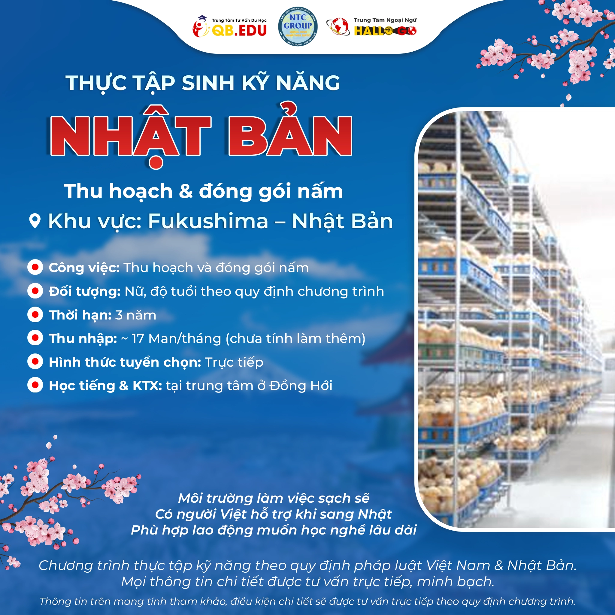 Nhật Bản từ lâu đã trở thành điểm đến hàng đầu của lao động Việt Nam nhờ môi trường làm việc chuyên nghiệp, thu nhập ổn định và cơ hội phát triển lâu dài. Trong năm 2026, chương trình thực tập sinh kỹ năng ngành nông nghiệp trồng trọt tại Fukushima chính thức tuyển dụng 6 nữ với công việc thu hoạch và đóng gói nấm.